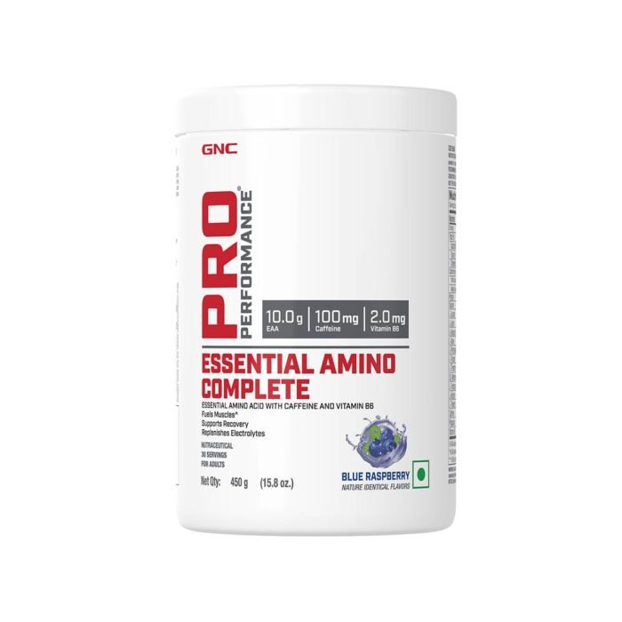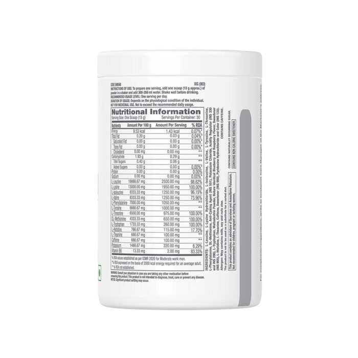 L-Leucine, L-Lysine Hydrochloride, L-Isoleucine, L-Valine, L-Tyrosine, L-Phenylalanine, DL-Methionine, Anti-Caking Agent (INS 551), Potassium Chloride, Acidity Regulator (INS 330 and INS 296), L-Tryptophan, Maltodextrin Powder, Nature Identical Blueberry and Raspberry Flavor, Sweetener (INS 955), L-Histidine, L-Theanine, Caffeine, Sweetener (INS 950), Pyridoxine
