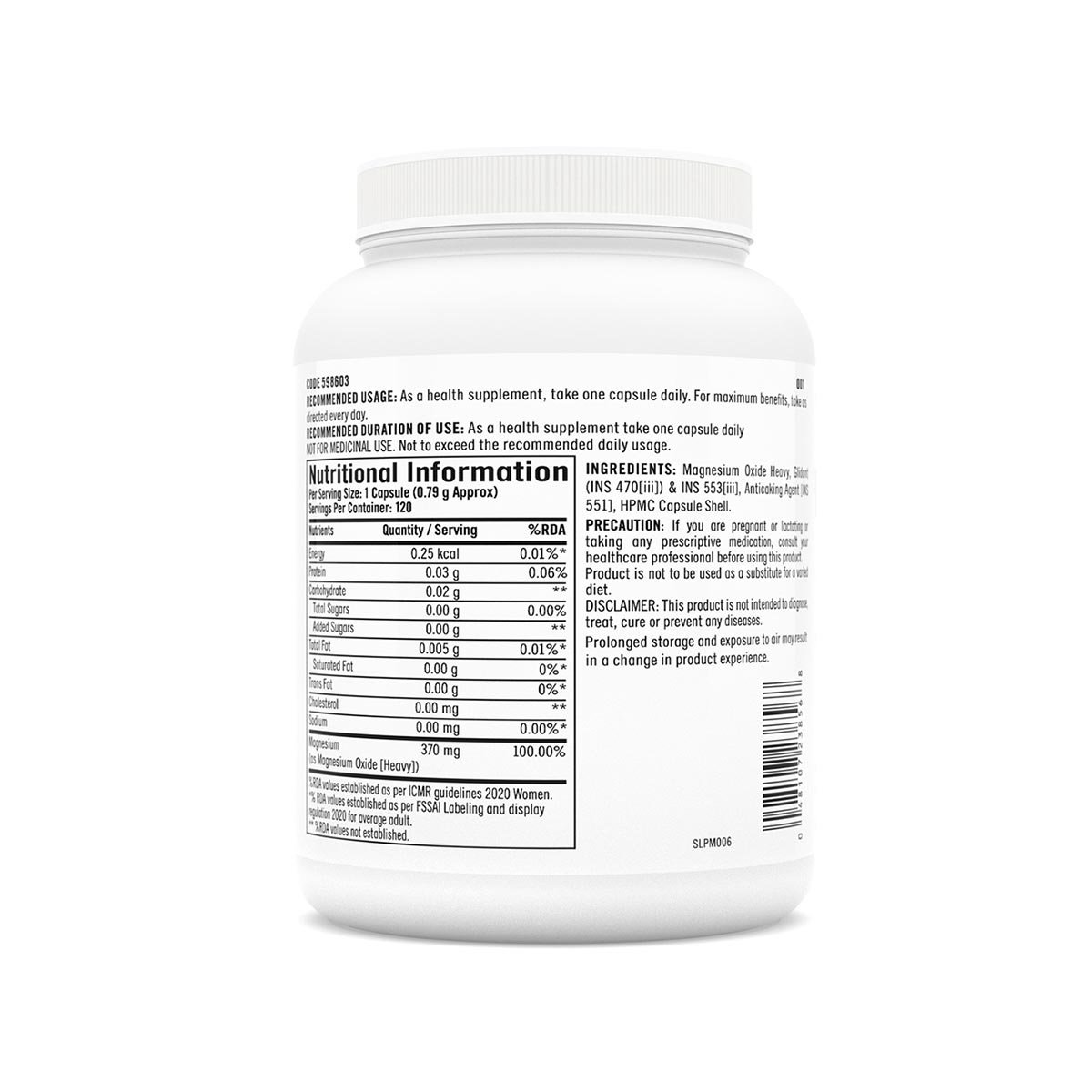 Magnesium Oxide Heavy, Glitt (INS 470[iii]) & INS 553[iii], Anticoking Agent ING 551], HPMC Capsule Shell.