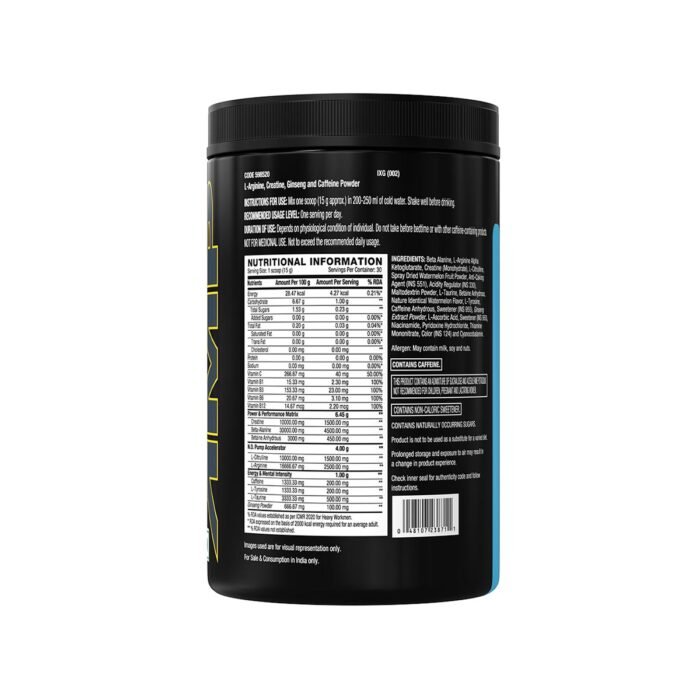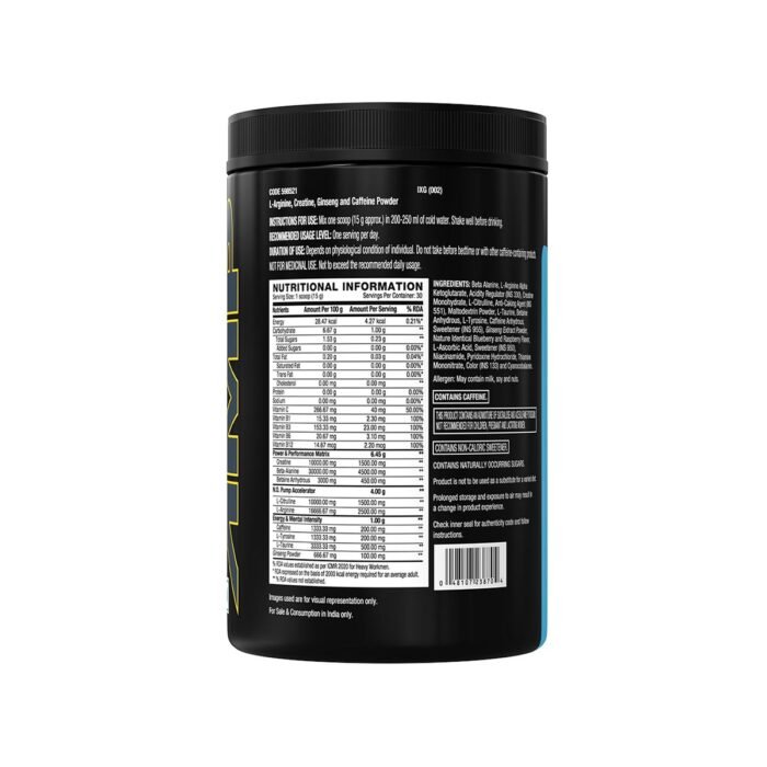 INGREDIENTS: Beta Alanine, L-Arginine Alpha Ketoglutarate, Acidity Regulator (INS 330), Creatine Monohydrate, L-Citrulline, Anti-Caking Agent (S 551), Maltodextrin Powder, L-Taurine, Betaine Anhydrous, L-Tyrosine, Caffeine Anhydrous, Sweetener (INS 955), Ginseng Extract Powder, Nature Identical Blueberry and Raspberry Flavor, L-Ascorbic Acid, Sweetener (INS 950) Niacinamide, Pyridoxine Hydrochloride, Thanire Mononitrate, Color (INS 133) and Cyanocobalamin. Allergen: May contain milk, soy and nuts.