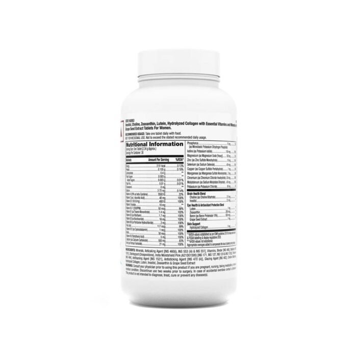 Minerals, Anticaking Agent [INS 460(i), INS 553 (iii) & INS 551], Vitamins, Binder [INS 466], Stabilizer [INS 1201], Disintegrant (Crospovidone), Insta Moistshield Pink (A21D01595) [INS 171, INS 127, INS 124 & INS 172(i)], Thickener [INS 464], Antifoaming Agent [INS 1521], Antisticking Agent [INS 470 (iii)], Glazing Agent [INS 462], Choline Bitartrate, Hydrolyzed Collagen, Lutein, Inositol, Zeaxanthin & Grape Seed Extract